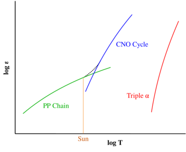 The type of hydrogen fusion process that dominates in a star is determined by the temperature dependency differences between the two reactions. The proton–proton chain reaction starts at temperatures about 4×106 K,[30] making it the dominant fusion mechanism in smaller stars. A self-maintaining CNO chain requires a higher temperature of approximately 16×106 K, but thereafter it increases more rapidly in efficiency as the temperature rises, than does the proton–proton reaction.[31] Above approximately 17×106 K, the CNO cycle becomes the dominant source of energy. This temperature is achieved in the cores of main-sequence stars with at least 1.3 times the mass of the Sun.[32] The Sun itself has a core temperature of about 15.7×106 K.[33]:5 As a main-sequence star ages, the core temperature will rise, resulting in a steadily increasing contribution from its CNO cycle.[25]