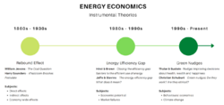 Development of energy economics theory over the last two centuries can be attributed to three main economic subjects – the rebound effect, the energy efficiency gap and more recently, 'green nudges'.