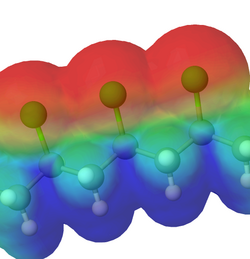 The Radio Frequency heating mechanism relies on a dipole in the molecule in order to generate heat and therefore the plastics used in RF Welding are limited to those whose molecules contain an electrical dipole.[5] Permanent molecular dipoles can form due to differences in electronegativities between the atoms of a molecule. Negative charge is shifted toward atoms with higher electronegativity, resulting in more negatively charged regions surrounding more electronegative atoms, and positively charged regions surrounding less electronegative atoms.[1] Because polyethylene consists of symmetric mer groups, no dipole forms, and polyethylene cannot be joined using radio-frequency welding. Like water, polyvinyl chloride (PVC) consists of asymmetrically distributed atoms of differing electronegativities, with a resulting dipole moment. Because of its strong dipolar moment (and other properties) PVC is considered an excellent material for radio-frequency welding. In addition to polarity, properties that contribute to good radio-frequency weldability are high dielectric constant, which reduces resistance to current flow; high dielectric strength, which prevents arcing through the joint members during welding; and high dielectric loss, which is a factor that describes the amount of heat generated by an electric field.[1][2]