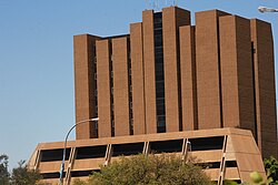 Orapa House, owned by Debswana, is where the diamonds mined from Debswana are sorted and valued. Orapa House is located at the intersection of Khama Crescent and Nelson Mandela Drive.[49] It has a unique style of architecture that allows the optimal amount of indirect sunlight to shine through the windows in order to accurately sort diamonds.[53]