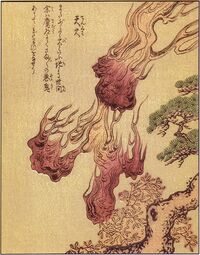 In the Tamana District, Kumamoto Prefecture, it is a mysterious fire that would fall from the heavens and has a size about that of a paper lantern, and it is said that a conflagration results when it falls on the roof of a house.[1] In the Saga Prefecture region, they were thought of as a premonition for a conflagration, and were detested.[1]