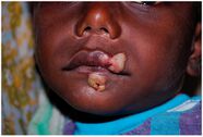 There are limited data available on the prevalence of yaws, although it primarily affects children.[51] The mortality risk is very low, but the disease causes disfigurement and disability if untreated.[51] The most common symptom is skin lesions.[51] It is a chronic bacterial infection, transmitted by skin contact, and caused by the spirochete bacterium Treponema pallidum pertenue.[51] It is treated with antibiotics and can be prevented through hygiene and sanitation.[51] Yaws is most prevalent in warm, moist tropical regions of the Americas, Africa, Asia, and the Pacific.[51]