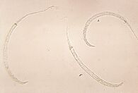 Dracunculiasis is also known as Guinea-worm disease. In 2019, 53 cases were reported across four countries,[44] a substantial decrease from 3,500,000 cases in 1986.[45] It is not fatal, but can cause months of inactivity.[46] It is caused by drinking water contaminated by water fleas infected with guinea-worm larvae.[46] Approximately one year after infection, a painful blister forms and one or more worms emerge. Worms can be up to 1 metre long.[46]