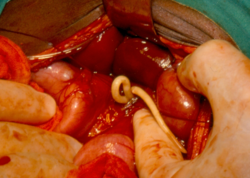 There are over 200 million cases of schistosomiasis.[16] Approximately 85 percent of cases are in sub-Saharan Africa.[16] The disease can be fatal by causing bladder cancer and hematemesis.[16] Schistosoma species have a complex life cycle that alternates between humans and freshwater snails. Infection occurs when the skin comes into contact with contaminated fresh water in which snails that carry the parasite are living. Symptoms for schistosomiasis are not caused by the worms but by the body's reaction to the eggs. The eggs that do not pass out of the body can become lodged in the intestine or bladder, causing inflammation or scarring. Children who are repeatedly infected can develop anemia, malnutrition, and learning difficulties.[75] The symptoms are usually haematuria, bladder obstruction, renal failure, bladder cancer, periportal fibrosis, bladder fibrosis, liver fibrosis, portal hypertension, cervical lesions, ascites, and esophageal varices.[18][16]