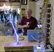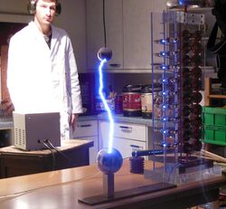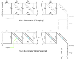 From Handwiki A Marx generator is an electrical circuit first described by Erwin Otto Marx in 1924.[1] Its purpose is to generate a high-voltage pulse from a low-voltage DC supply. Marx generators are used in high-energy physics experiments, as well as to simulate the effects of lightning on power-line gear and aviation equipment. A bank of 36 Marx generators is used by Sandia National Laboratories to generate X-rays in their Z Machine.