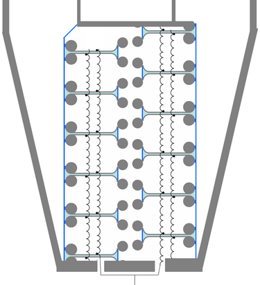 The charging resistors, Rc, need to be properly sized for both charging and discharging. They are sometimes replaced with inductors for improved efficiency and faster charging. In many generators the resistors are made from plastic or glass tubing filled with dilute copper sulfate solution. These liquid resistors overcome many of the problems experienced by more-conventional solid resistive materials, which have a tendency to lower their resistance over time under high voltage conditions.