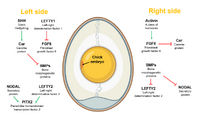 Much of the investigation of the genetic basis of symmetry breaking has been done on chick embryos. In chick embryos the left side expresses genes called NODAL and LEFTY2 that activate PITX2 to signal the development of left side structures. Whereas, the right side does not express PITX2 and consequently develops right side structures.[39][40] A more complete pathway is shown in the image at the side of the page.