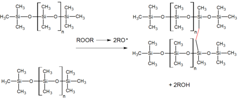 Peroxide curing is widely used for curing silicone rubber. The curing process leaves behind byproducts, which can be an issue in food contact and medical applications. However, these products are usually treated in a postcure oven which greatly reduces the peroxide breakdown product content. One of the two main organic peroxides used, dicumyl peroxide (compare cumene hydroperoxide), has principal breakdown products of acetophenone and phenyl-2-propanol. The other is dichlorobenzoyl peroxide, whose principal breakdown products are dichlorobenzoic acid and dichlorobenzene.[6]