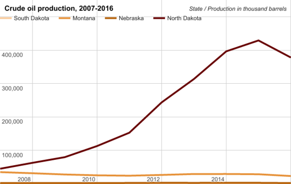 Crude oil production in South Dakota and neighboring states (2007-2016)
