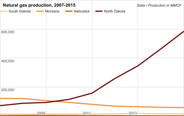 Natural gas production in South Dakota and neighboring states (2007-2015)