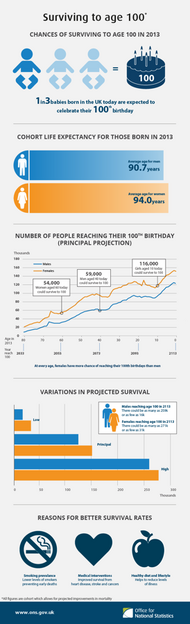 As world population and life expectancy continue to increase, the number of centenarians is expected to increase substantially in the twenty-first century.[2] According to the Office of National Statistics in the United Kingdom, one-third of babies born in the country in 2013 are expected to live to 100.[3]