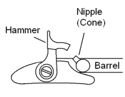 The caplock mechanism consists of a hammer, similar to the hammer used in a flintlock, and a nipple (sometimes referred to as a "cone"), which holds a small percussion cap. The nipple contains a tube that goes into the barrel. The percussion cap contains a chemical compound called mercury fulminate or fulminate of mercury, the chemical formula of which is Hg(ONC)2.[17] It is made from mercury, nitric acid, and alcohol. When the trigger releases the hammer, it strikes the cap, causing the mercuric fulminate to explode. The flames from this explosion travel down the tube in the nipple and enter the barrel, where they ignite the main powder charge.[17]