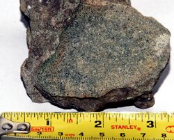 Greensand or green sand is a sand or sandstone which has a greenish color. This term is specifically applied to shallow marine sediment that contains noticeable quantities of rounded greenish grains. These grains are called glauconies and consist of a mixture of mixed-layer clay minerals, such as smectite and glauconite. Greensand is also loosely applied to any glauconitic sediment.[1][2][3]