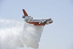 The largest aerial firefighter ever used is a Boeing 747 aerial firefighter, known as the Global Supertanker, that can carry 19,600 US gallons (74,200 l) fed by a pressurized drop system. The Supertanker was deployed operationally for the first time in 2009, fighting a fire in Spain.[11] The tanker made its first American operation on August 31, 2009 at the Oak Glen Fire.[12][13] It has since been replaced by a Boeing 747-400.[14] Another wide body jetliner that is currently being used as an air tanker is the modified McDonnell Douglas DC-10 operated by the 10 Tanker Air Carrier company as the DC-10 Air Tanker.[15] It can carry up to 12,000 US gallons (45,400 l) of fire fighting retardant.