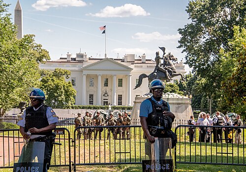 ). He ordered hundreds of out-of-state National Guard members to patrol the streets of D.C. against the mayor's will[163], deployed 1,600 active-duty troops on the capital’s doorstep,[164] and even suggested on several occasions that the protestors should be beaten[165] or shot.[166] When soldiers were going to be recalled back to their homebases, Trump's Defense Secretary, Mark Esper, overruled them and forced them back to the streets.[167] This use of the military as his personal weapon to bludgeon the people is a very dangerous precedent to set.[168] There's a stunning shot of soldiers standing sentinel at the Lincoln Memorial against peaceful masked protesters, in the middle of a pandemic, an image that will be remembered for years to come.[169]