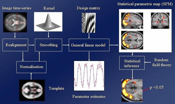 SPM is a voxel-based approach, employing classical statistics and topological inference, to make comments about regionally specific responses to experimental factors. PET or fMRI data are first spatially processed so that they conform to a known anatomical space, in which responses are characterized statistically typically using the General Linear Model (GLM). For fMRI data the GLM embodies a convolution model of the hemodynamic response. This accounts for the fact that BOLD signals are a delayed and dispersed version of the neuronal response. GLMs are fitted at each voxel and inferences are made about which parts of the brain are active, in a statistical sense. To accommodate the spatial nature of the imaging data (and account for the multiple statistical comparisons made) SPM techniques make use of Random Field Theory (RFT) (see Fig 1) and/or other statistical procedures, e.g., False Discovery Rate.