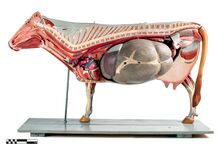 The gestation period for a cow is about nine months long. The secondary sex ratio – the ratio of male to female offspring at birth – is approximately 52:48, although it may be influenced by environmental and other factors.[46] A cow's udder contains two pairs of mammary glands, (commonly referred to as teats) creating four "quarters".[47] The front ones are referred to as fore quarters and the rear ones rear quarters.[48]