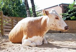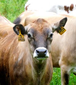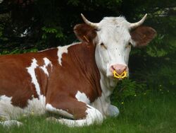| A brown Swiss Fleckvieh cow wearing a cowbell | |