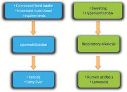 Climate change is expected to exacerbate many of the animal welfare issues already faced by cattle. For instance, as of 2020, it was found that in the current Eastern Mediterranean climate, cattle experience mild heat stress inside unadapted stalls for nearly half a year (159 days), while moderate heat stress is felt indoors and outdoors during May, June, July, August, September, and October. Additionally, June and August are the months where cattle are exposed to severe heat stress outside, which is mitigated to moderate heat stress indoors.[245] Heat-stressed cattle have displayed reduced albumin secretion and liver enzyme activity. This is attributed to accelerated breakdown of adipose tissue by the liver, causing lipidosis.[244] Cattle also eat less when they experience acute heat stress during hottest parts of the day, only to compensate when it is cooler, and this disbalance soon causes ruminal acidosis, which can lead to laminitis. Additionally, one of the ways cattle can attempt to deal with higher temperatures is by panting more often, which rapidly decreases carbon dioxide concentrations and increases pH. To avoid respiratory alkalosis, cattle are forced to shed bicarbonate through urination, and this comes at the expense of rumen buffering. These two pathologies can both develop into lameness, defined as "any foot abnormality that causes an animal to change the way that it walks". This effect can occur "weeks to months" after severe heat stress exposure, alongside sore ulcers and white line disease.[244]