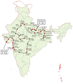 In September 1990, Advani began a rath yatra (chariot journey) to Ayodhya in support of the Ram temple movement. According to Guha, the imagery employed by the yatra was "religious, allusive, militant, masculine, and anti-Muslim".[30] Advani was placed under preventive detention on the orders of the then Bihar chief minister Lalu Prasad Yadav. A large number of kar sevaks (religious volunteers) nonetheless converged at Ayodhya, and some attacked the mosque. Three days of fighting with the paramilitary forces ended with the deaths of several kar sevaks. Hindus were urged by VHP to "take revenge" for these deaths, resulting in riots against Muslims across Uttar Pradesh. [31] The BJP withdrew its support from the V.P. Singh government, leading to fresh general elections. The BJP further increased its tally to 120 seats, and won a majority in the Uttar Pradesh assembly.[32]