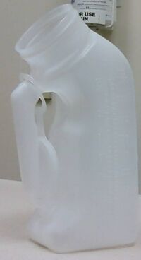 A urinal, urine bottle, or male urinal is a bottle for urination.[1] It is most frequently used in health care for patients who find it impossible or difficult to get out of bed during sleep. Urinals allow the patient who has cognition and movement of their arms to urinate without the help of staff. A urinal bottle can also be used by travelers or transportation workers who are unable to immediately use a public restroom as part of an emergency kit, or in areas where restroom facilities are too distant.