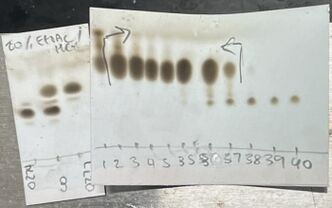For larger-scale purification and isolation, TLC is useful to quickly test solvent mixtures before running flash column chromatography on a large batch of impure material.[13][23] A compound elutes from a column when the amount of solvent collected is equal to 1/Rf.[24] The eluent from flash column chromatography gets collected across several containers (for example, test tubes) called fractions. TLC helps show which fractions contain impurities and which contain pure compound.[citation needed]