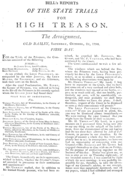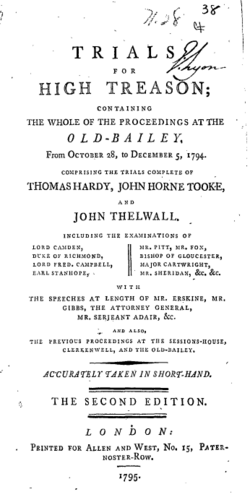 John Thelwall was tried last; the government felt forced to try him because the loyalist press had argued that his case was particularly strong.[26] While awaiting trial, he wrote and published poetry indicting the entire process.[29] During Thelwall's trial, various members of the London Corresponding Society testified that Thelwall and the others had no concrete plans to overthrow the government, and that details of how reform was to be achieved were an "afterthought". This undermined the prosecution's claims that the society was responsible for fomenting rebellion.[32] Thelwall was also acquitted, after which the rest of the cases were dismissed.[33]