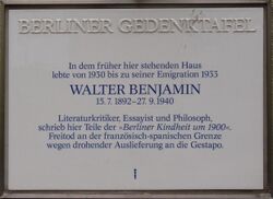 A commemorative plaque is located by the residence where Benjamin lived in Berlin during the years 1930–1933: (Prinzregentenstraße 66, Berlin-Wilmersdorf). A commemorative plaque is located in Paris (10 rue Dombasle, 15th) where Benjamin lived in 1938–1940.