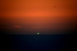 As an astronomical object sets or rises in relation to the horizon, the light it emits travels through Earth's atmosphere, which works as a prism separating the light into different colors. The color of the upper rim of an astronomical object could go from green to blue to violet depending on the decrease in concentration of pollutants as they spread throughout an increasing volume of atmosphere.[9] The lower rim of an astronomical object is always red.