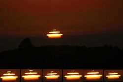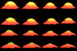 | Mock-mirage flash | Indentations seem to "pinch off" a thin, pointy strip from the upper rim of the Sun; lasts 1 or 2 seconds | Atmospheric inversion layer below eye level; surface colder than air | The higher the eye, the more likely; flash is most obvious when the eye is just above the inversion. |