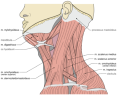 Muscles of the neck attach to the skull, hyoid bone, clavicles and the sternum. They bound the two major neck triangles; anterior and posterior.[1][7]