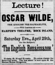 Aestheticism was sufficiently in vogue to be caricatured by Gilbert and Sullivan in Patience (1881). Richard D'Oyly Carte, an English impresario, invited Wilde to make a lecture tour of North America, simultaneously priming the pump for the US tour of Patience and selling this most charming aesthete to the American public. Wilde journeyed on the SS Arizona, arriving on 2 January 1882 and disembarking the following day.[72][lower-alpha 3] Originally planned to last four months, the tour continued for almost a year owing to its commercial success.[74] Wilde sought to transpose the beauty he saw in art into daily life.[75] This was a practical as well as philosophical project: in Oxford he had surrounded himself with blue china and lilies, and now one of his lectures was on interior design. In a British Library article on aestheticism and decadence, Carolyn Burdett writes,