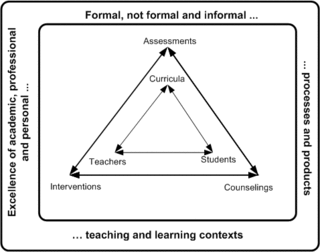 Psychology is a well-developed discipline that allows different specializations, which include; clinical and health psychology, work and organizational psychology, educational psychology, etc.[1][2][3][4][5][6][7] What differentiates an educational psychologist from other psychologists or specialists is constituted by an academic triangle whose vertexes are represented by three categories: teachers, students, and curricula (see diagram). The use of plural in these three cases assumes two meanings; the traditional or official one and other more general derived from our information and knowledge society. The plural also indicates that nowadays, we can no longer consider the average student or teacher, or a closed curriculum, but the enormous variety found in our students, teachers, and curricula. The triangle vertexes are connected by two-directional arrows, allowing four-fold typologies instead of the traditional two-way relationships (e.g., teacher-student). In this way, we can find, in different educational contexts, groups of good teachers and students (excellent teaching/learning processes and products), groups of good teachers but bad students, and groups of bad teachers and good students, producing in both cases lower levels of academic achievements. In addition, we can find groups of bad teachers and bad students (school failure). This specific work of an educational psychologist takes place in different contexts: micro-, meso- and macro-systems.[8] Microsystems refer to family contexts, where atmosphere, hidden curriculum, and expectations and behaviors of all family members determine, to a large extent, the educational development of each student. The term mesosystem refers to all variety of contexts found in educational institutions, knowing that different variables such as geographical location, institution marketing or type of teachers and students, etc., can influence the academic results of students. Macrosystem has a much more general and global nature, leading us, for example, to consider the influence that the different societies or countries have on educational final products. One illustrative example of this level can be the analyses carried out on data gathered by the PISA reports. This approach would be the essence of educational psychology versus school psychology for many of U.S. educational researchers and for Division 15 of APA.