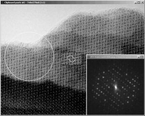 - ↑ Weirich, T; Portillo, J; Cox, G; Hibst, H; Nicolopoulos, S (2006). "Ab initio determination of the framework structure of the heavy-metal oxide CsxNb2.54W2.46O14 from 100kV precession electron diffraction data". Ultramicroscopy 106 (3): 164–75. doi:10.1016/j.ultramic.2005.07.002. PMID 16137828.