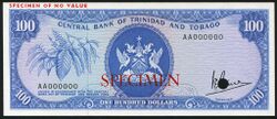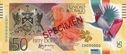 On 14 December 1964, the Central Bank of Trinidad and Tobago introduced notes for $1, $5, $10 & $20.[21] New denominations in the form of $50 & $100 notes were issued on 6 June 1977, although the $50 note was not continued after a shipment was stolen prior to issue. The $50 note was taken out of its brief circulation. The reverses of the current notes feature the Central Bank Building of Trinidad & Tobago. The obverses have the coat of arms in the center, a national bird and a place in Trinidad, such as a market, petroleum refinery, etc. In 2002, new $1 & $20 notes were introduced. In 2003, new $1, $5, $10 & $100 were also introduced. The notes were only slightly changed; they now have more security features & darker colour. Recently, more security features have been added to the notes by the Central Bank of Trinidad and Tobago. In 2012 the $50 note was reintroduced to commemorate Trinidad and Tobago's Golden Jubilee of Independence. On the front of the note is a Red-capped cardinal bird and the commemorative text around the center of the coat of arms.[22] Two versions of this denomination were released, one without the commemorative text around the centre of the coat of arms (general circulation) and one with the commemorative text.