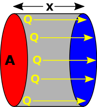 Consider a simple linear situation (see diagram), where there is uniform temperature across equally sized end surfaces and the sides are perfectly insulated. In such a case, integration of the above differential equation gives the heat flow rate between the end surfaces as: