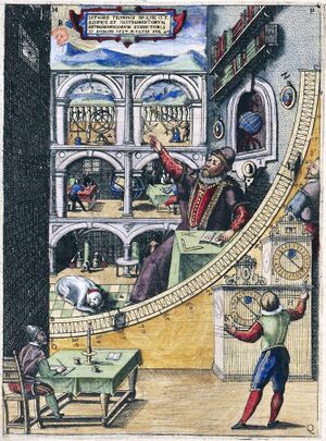 The first modern science, in which practitioners were prepared to revise or reject long-held beliefs in the light of new evidence, was astronomy, and Tycho Brahe was the first modern astronomer. See Sextant, right. Note the explicit reduction of geometrical diagrams to practice (real objects with actual lengths and angles).