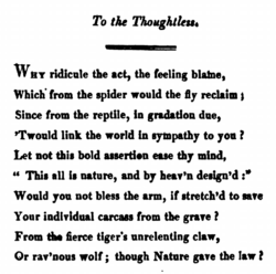Isaac Gompertz, the brother of Lewis Gompertz, in his 1813 poem "To the Thoughtless", criticises the assertion that human consumption of other animals is justified because it is designed that way by nature, inviting the reader to imagine themselves being predated by an animal and to consider whether they would want to have their life saved, in the same way an animal being preyed upon—such as a fly attacked by a spider—would, despite predation being part of nature-given law.[218]