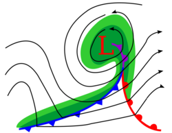 Occluded fronts are indicated on a weather map by a purple line with alternating half-circles and triangles pointing in direction of travel.[2] The trowal is indicated by a series of blue and red junction lines.