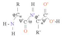 The protein structure can be considered as a sequence of secondary structure elements, such as α helices and β sheets. In these secondary structures, regular patterns of H-bonds are formed between the main chain NH and CO groups of spatially neighboring amino acids, and the amino acids have similar Φ and ψ