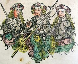 Medieval and Renaissance authors credit the Amazons with the invention of the battle-axe. This is probably related to the sagaris, an axe-like weapon associated with both Amazons and Scythian tribes by Greek authors (see also Thracian tomb of Aleksandrovo kurgan). Paulus Hector Mair expresses astonishment that such a "manly weapon" should have been invented by a "tribe of women", but he accepts the attribution out of respect for his authority, Johannes Aventinus.