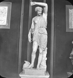 Pausanias at the Description of Greece writes that near Pyrrhichus there were sanctuaries of the gods Artemis, called Astrateia (Ancient Greek:), and Apollo, called Amazonius (Ancient Greek:) with images of the gods said to have been dedicated by the women from Thermodon.[132]