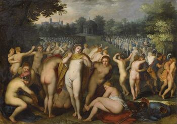 In another myth Dionysus united with the Amazons to fight against Cronus and the Titans.[67] Polyaenus writes that after Dionysus had subdued the Indians, he formed an alliance with them and the Amazons, and took them into his service. He later used them in his campaign against the Bactria.[68] Nonnus in his Dionysiaca writes about the Amazons of Dionysus, but he says that they were not from Thermodon.[36]