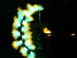 where [math]\displaystyle{ V_\mathrm{b} }[/math] is the breakdown potential in volts DC, [math]\displaystyle{ A }[/math] and [math]\displaystyle{ B }[/math] are constants that depend on the surrounding gas, [math]\displaystyle{ p }[/math] represents the pressure of the surrounding gas, [math]\displaystyle{ d }[/math] represents the distance in centimetres between the electrodes,[clarification needed] and [math]\displaystyle{ \gamma_\mathrm{se} }[/math] represents the Secondary Electron Emission Coefficient.