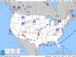 On weather maps, the surface location of a warm front is marked with a red line of half circles pointing in the direction of the front. On colored weather maps, warm fronts are illustrated with a solid red line.