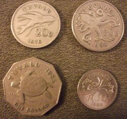 The Tuvaluan dollar is one of the currencies of Tuvalu, whose unofficial international currency code is TVD.[1] Tuvalu has never had banknotes of its own, and has been issuing coins since 1976. However, the Tuvaluan dollar is used as a unit of account, and is pegged to the Australian dollar (the other currency of Tuvalu) at parity. From 1966 to 1976, Tuvalu officially used the Australian dollar. In 1976, Tuvalu began issuing its own coins, which continue to circulate alongside Australian coins. Tuvalu continues to use Australian banknotes. Tuvaluan coins are not legal tender in Australia. Similar to the Faroese króna's relationship to the Danish krone and the Panamanian balboa's relationship to the United States dollar , the Tuvaluan dollar is not an independent currency, but a variation of the Australian dollar.
