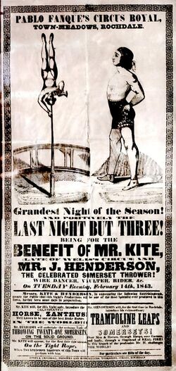 An 1843 Victorian circus poster for the Pablo Fanque Circus, which inspired the 1967 Beatles song "Being for the Benefit of Mr. Kite!", a homage to Victorian circuses
