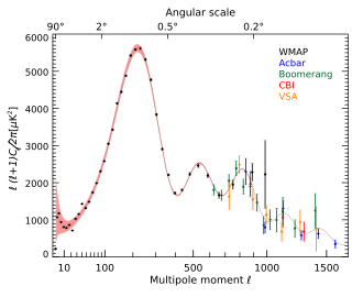 Note the many colored spots that can be seen on the map of the cosmic microwave background taken by the WMAP satellite, showing very small (millionths of K) temperature differences on it. Most of them are irregularities born in the cosmic inflation, that erased almost all the pre-inflationary ones, and are the seeds around which grew the structure of the Universe[26]. The angular power spectrum describes on what scale these variations tend to occur. The exact shape of this spectrum can be predicted from theory and shows good agreement with experiment.[27]