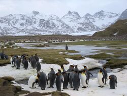 The crèche group behaviour will also be seen in many species of penguins. This behaviour will occur when multiple adult penguins rear their chicks together in a group formation.[3] In the majority of penguin crèches there will be more chicks than adults.[9] The main advantage of the crèche formation in penguins is to aid in thermoregulation [9][10] but the formation also helps prevent predation and aggression.[3] While living in a crèche the penguin chicks will be reared in the presence of multiple adults and therefore will be protected from aggressive adults or predators.[3] The largest crèche formations are seen when weather conditions are harsh.[10] These harsh conditions normally include very low temperatures and high humidity, wind speeds and cloud cover.[9] During these times in particular, there will be increased contact between adults and chicks as they gather together to provide warmth to one another to aid in thermoregulation.[10]