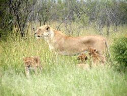 Crèche behaviours will also develop in certain species of lions. For the first four to six weeks of development, mothers will care for their young on their own to make sure they are getting the proper care and nutrition.[7] Once they reach six weeks, female pride mate mothers will group to form a crèche.[2] Mothers will form this crèche with other mothers who have cubs of the same age cubs.[8] These crèches could range from two to nine mothers, but they average around four to five mothers.[2] Females and their young will remain together in these crèches until the young have reached about two years of age.[2] Studies show that mothers in crèches which involve three to four females may suffer from low food intake.[2] The main advantage of crèches in lion species is for defence.[2] The mothers in a crèche will work together to defend their cubs and protect them from nomadic male lions or any other predators that may approach the pride.[2] The greater number of females in the crèche, the greater rates of male takeovers.[2] Being a member of a crèche, provides safety from predators for the cubs and ensures that the mother will forage in a group size close to optimum.[2] Studies have proven that mothers keep their cubs in crèche formations to initiate highly stable care groups that will aid in defence.[2] While crèches are great for defence, they have a contrasting impact on food intake. If there are a very high number of cubs in a crèche compared to mothers, the cubs could become severely undernourished.[8] As well, female lions without cubs will avoid a crèche as they would experience a low rate of food intake in that group living arrangement.[8] Studies have also shown that living in a crèche environment does not guarantee increased access and retrieval of resources.[7] When lions are nursing, the cubs that are raised in a crèche do not have an advantage of gaining more milk than their conspecifics who do not live in a crèche.[7]